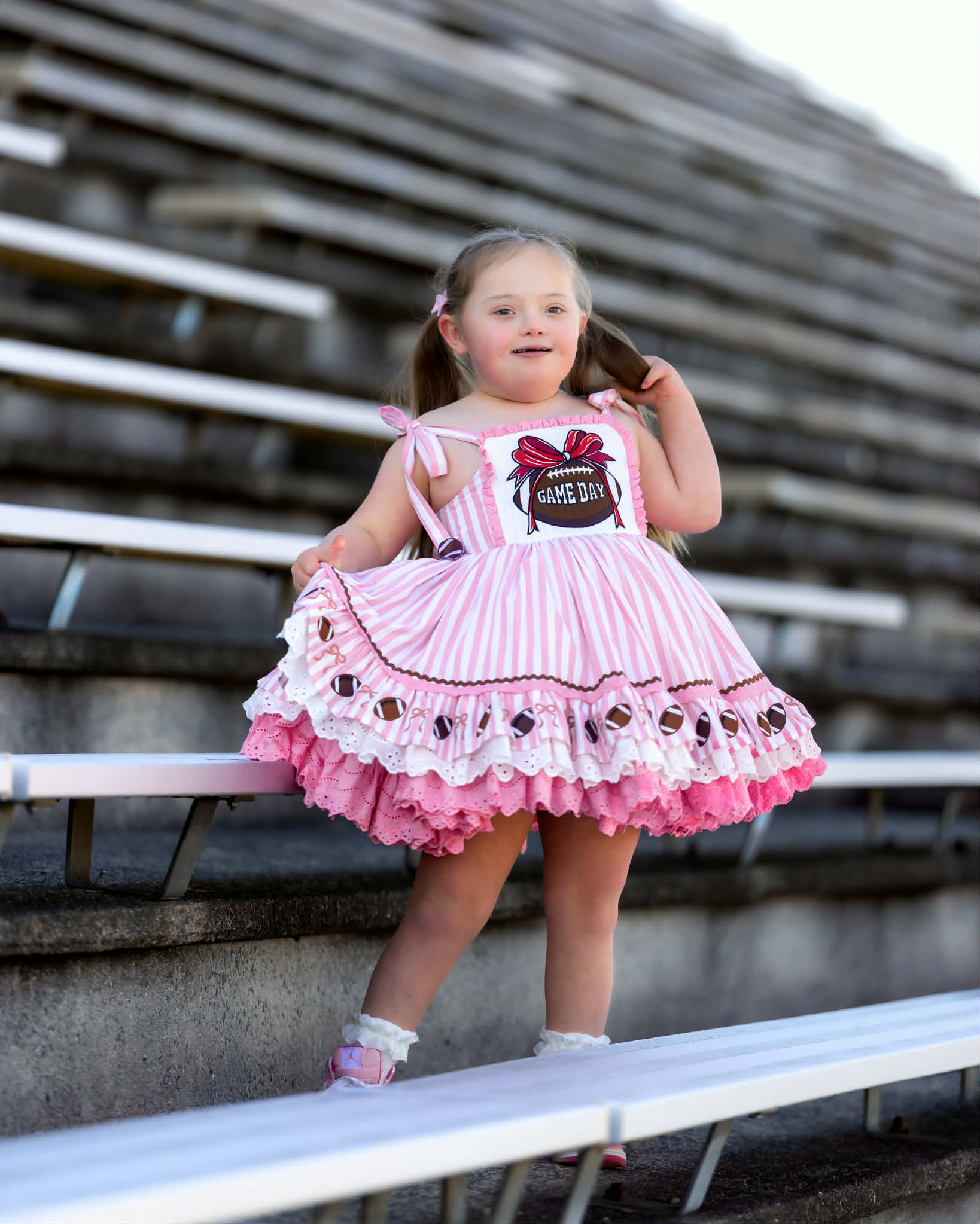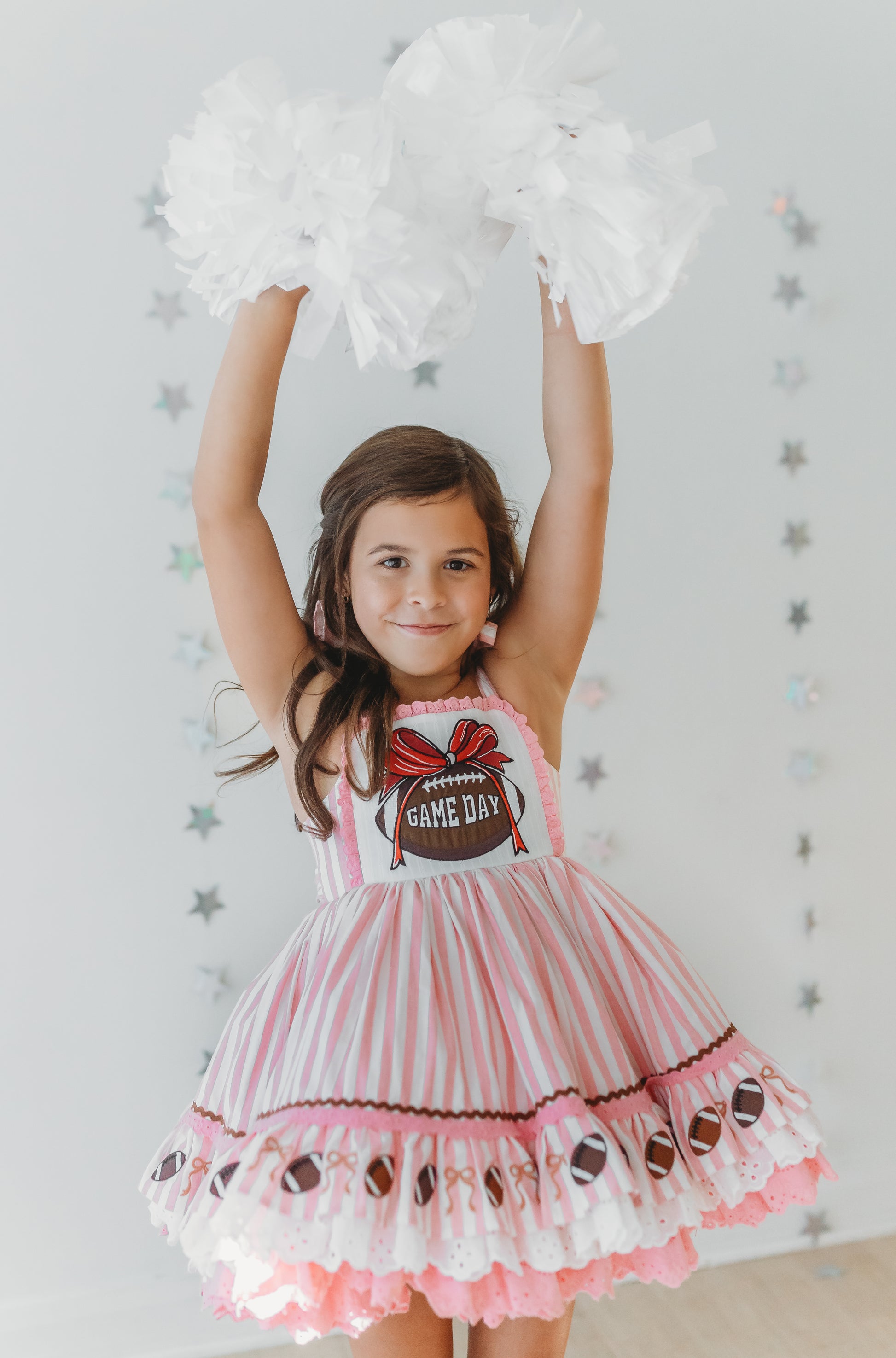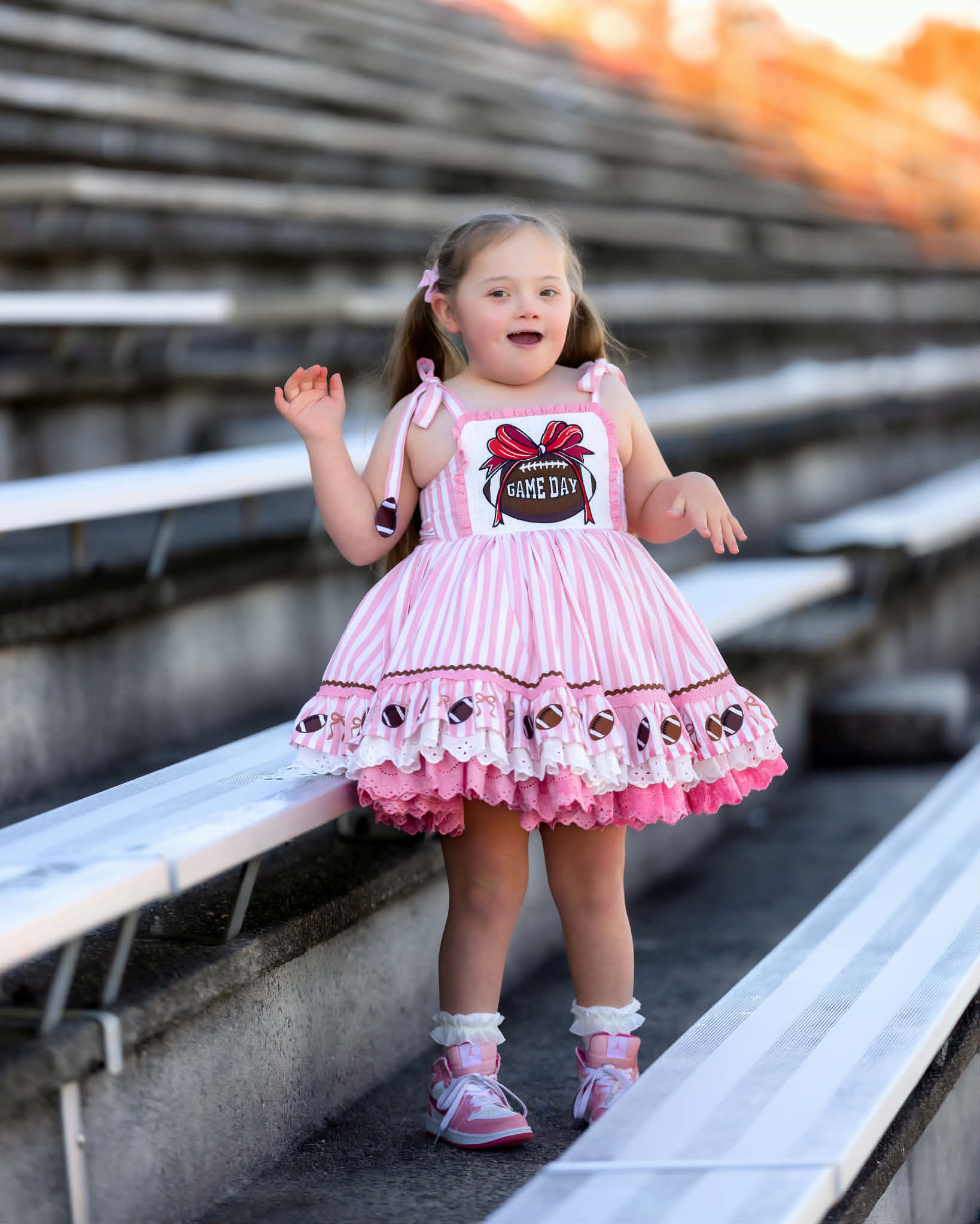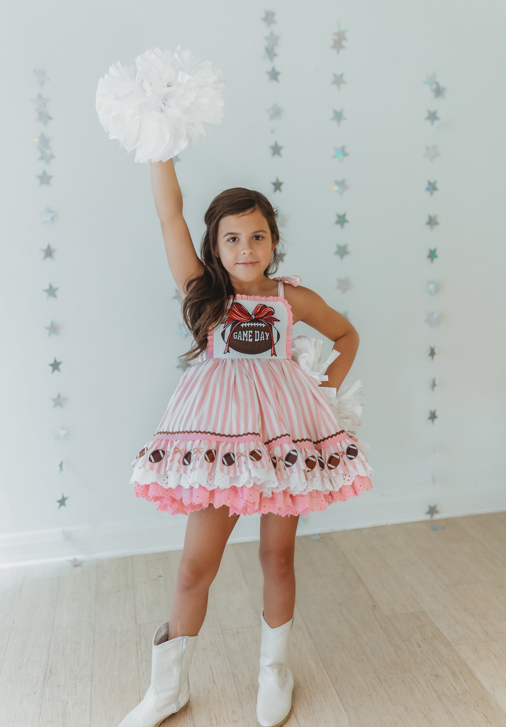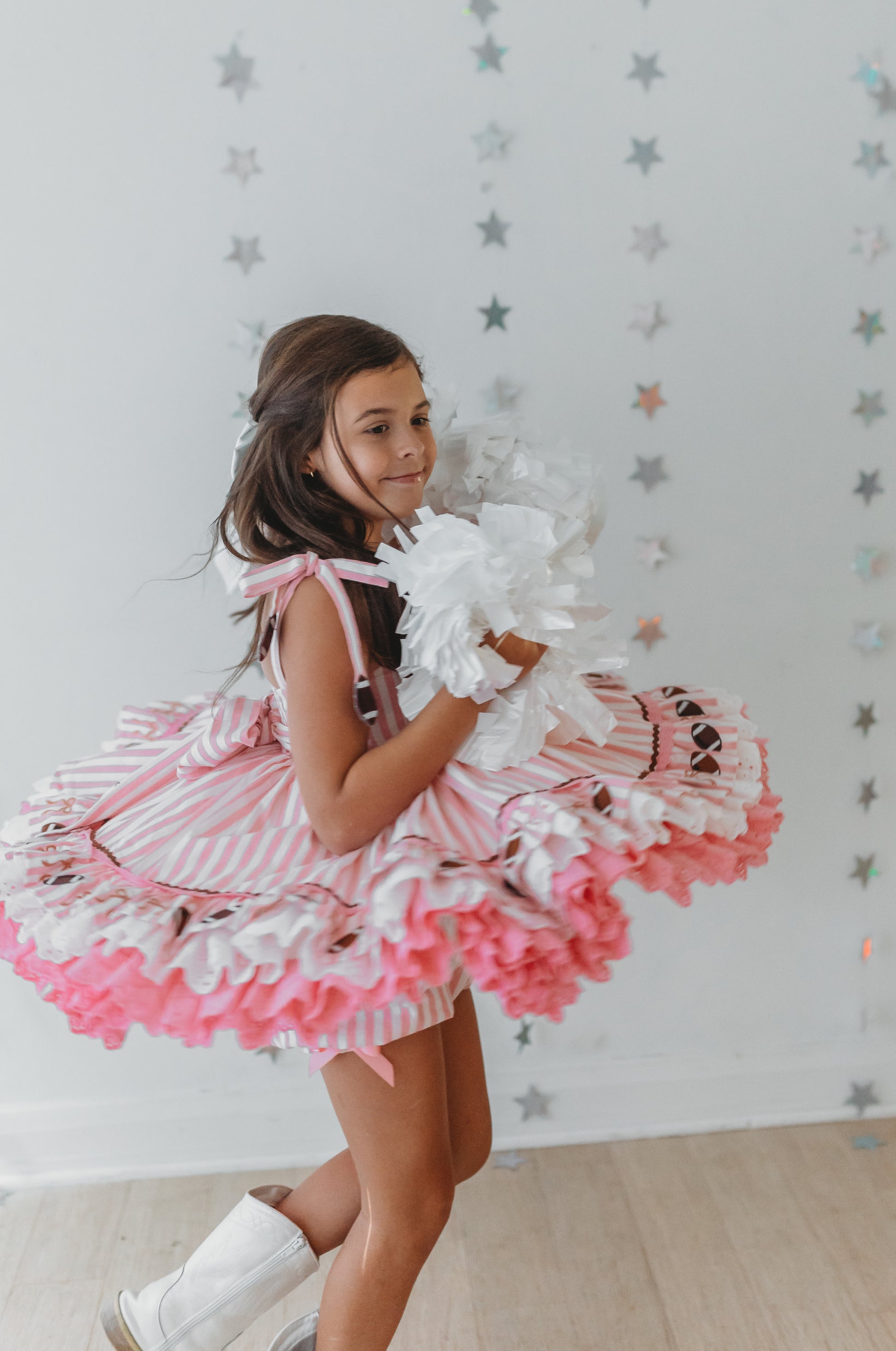 Make every cheer count in this pink and white striped, pettiskirt dress, crafted for girls who love the spotlight. A twirl worthy skirt reveals soft, pink lace beneath, adding subtle sophistication, while embroidered bows and footballs dance along the hem to capture playful attention. The bodice features a football accented with a bow, and the tie straps are finished with matching football appliqués, elevating this game day essential to designer status. A smocked back and a bow sash that cinches the waist, creates a comfortable and tailored fit. Matching bloomers included in every size to ensure a complete, polish look and also adds practicality. Ideal for Super Bowl celebrations, sibling spring ball games, and fight for the cure football events. This limited-edition piece is as unforgettable as the moments it celebrates.