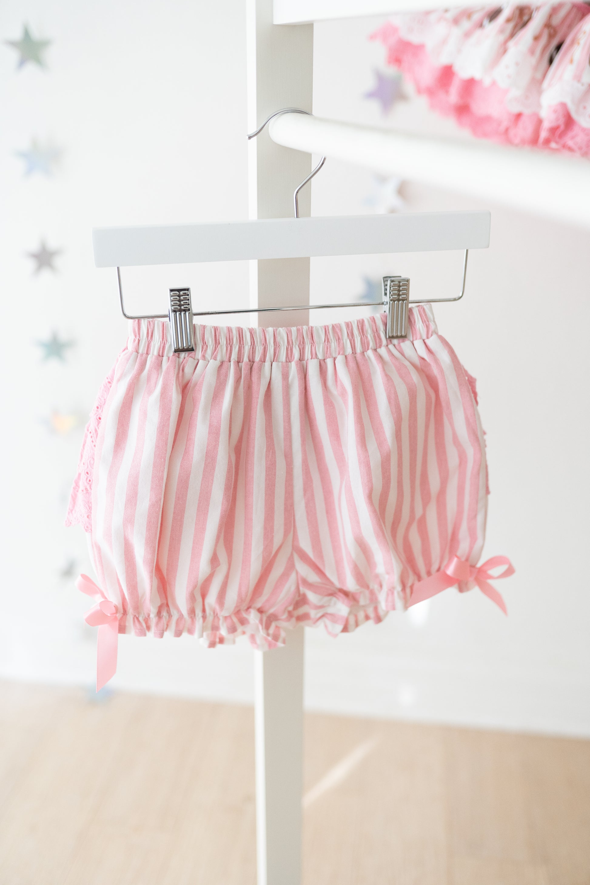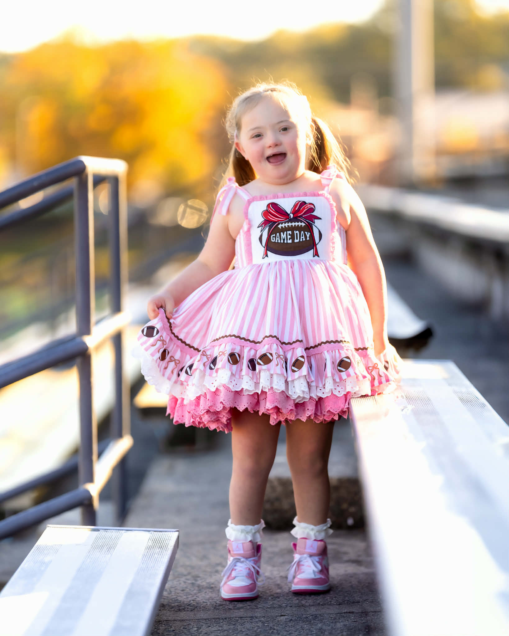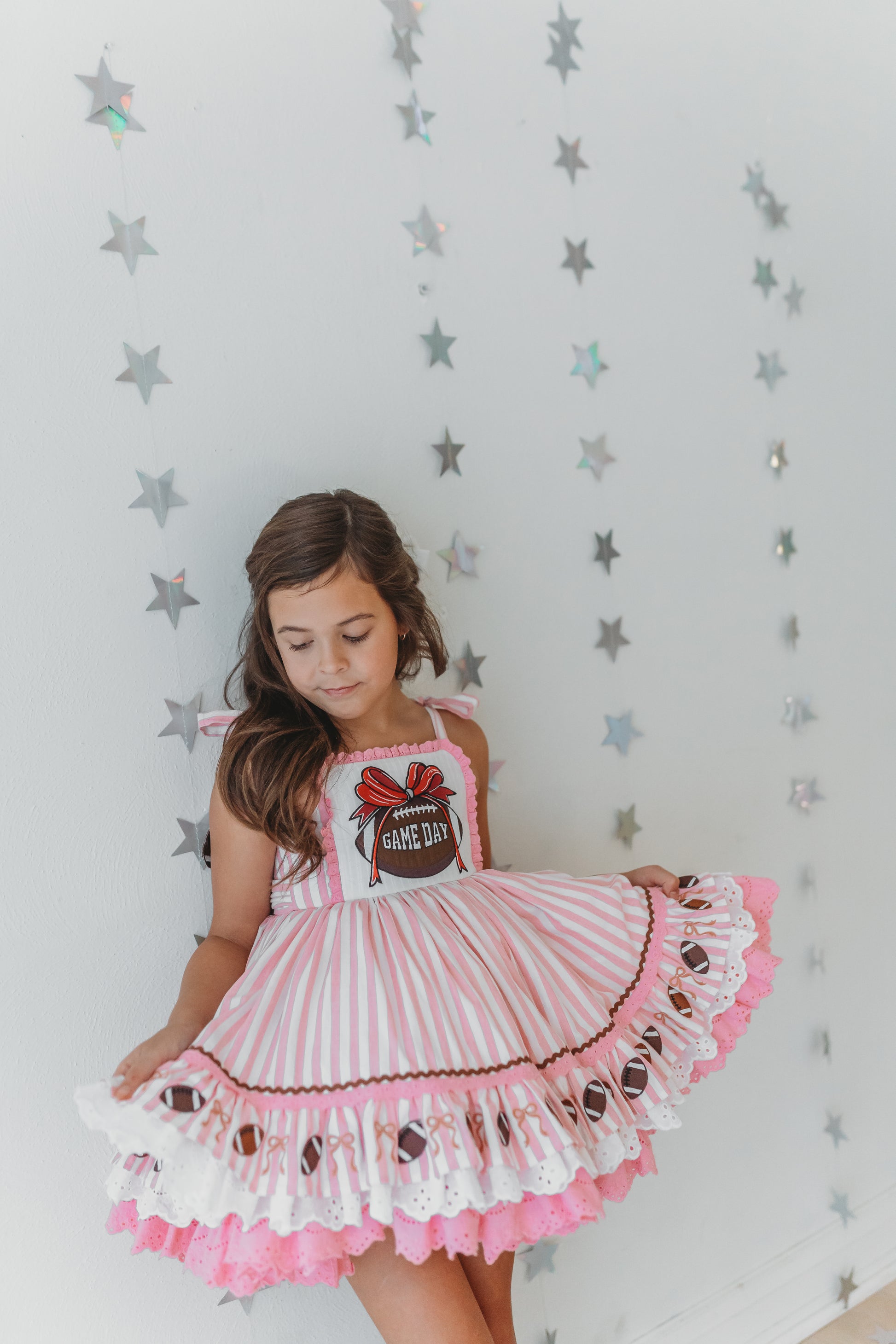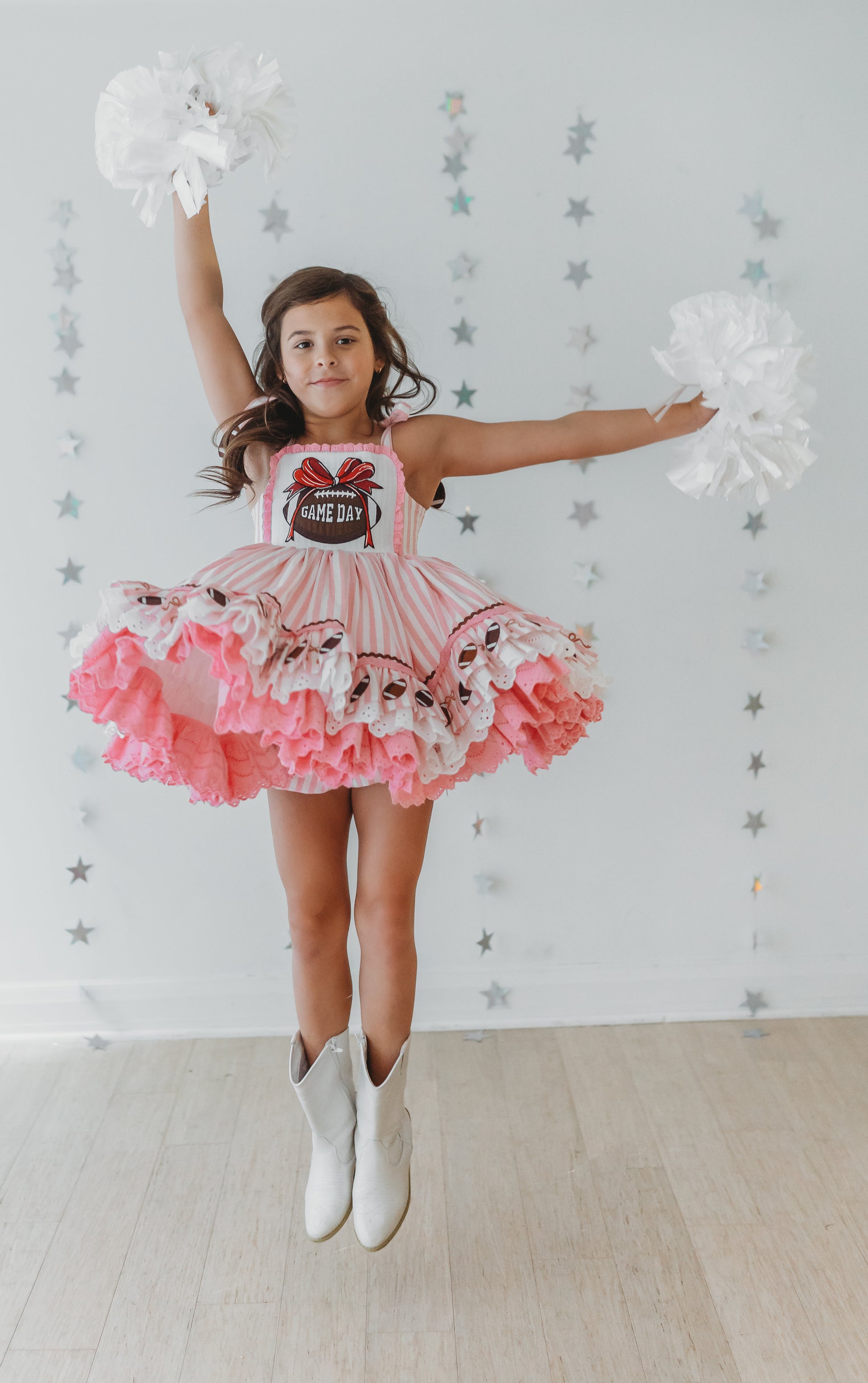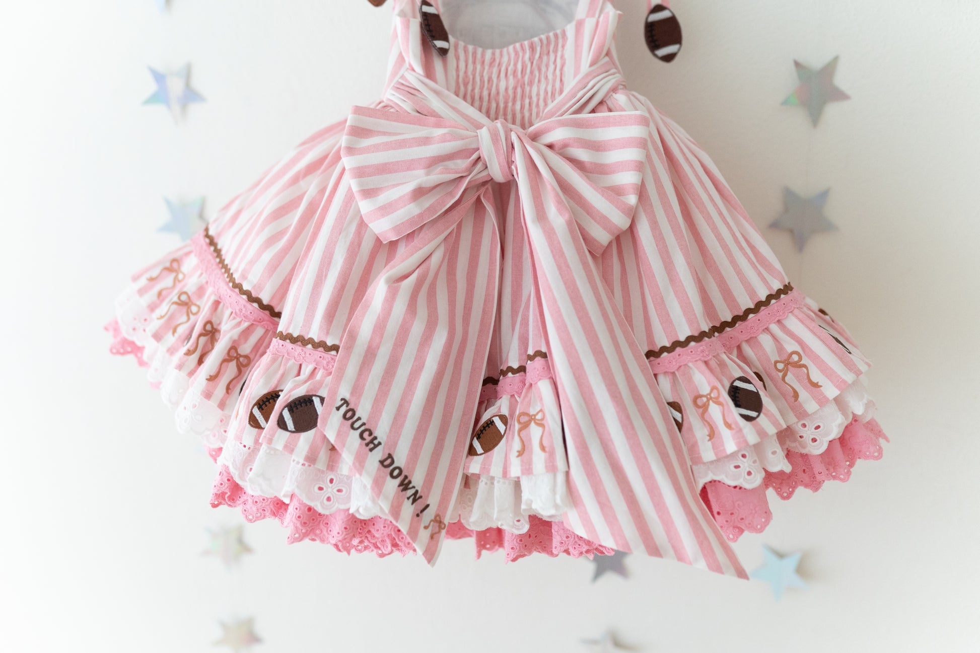 Make every cheer count in this pink and white striped, pettiskirt dress, crafted for girls who love the spotlight. A twirl worthy skirt reveals soft, pink lace beneath, adding subtle sophistication, while embroidered bows and footballs dance along the hem to capture playful attention. The bodice features a football accented with a bow, and the tie straps are finished with matching football appliqués, elevating this game day essential to designer status. A smocked back and a bow sash that cinches the waist, creates a comfortable and tailored fit. Matching bloomers included in every size to ensure a complete, polish look and also adds practicality. Ideal for Super Bowl celebrations, sibling spring ball games, and fight for the cure football events. This limited-edition piece is as unforgettable as the moments it celebrates.