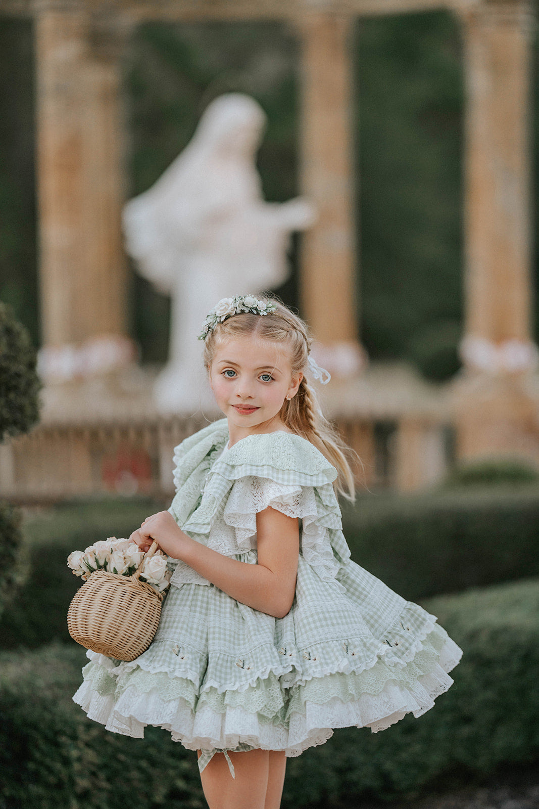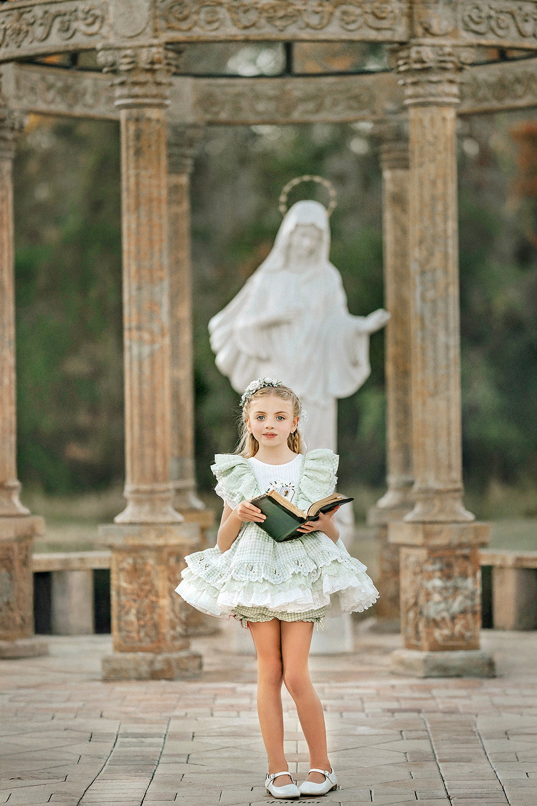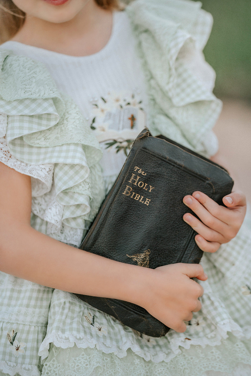 Fit for a garden court and cherished Sunday traditions, this heirloom-worthy dress is a vision of springtime reverence and refined beauty. Whisper soft layers of mint kissed gingham and lace billow into a gloriously full skirt, each step revealing embroidered magnolia blossoms dancing along the hem like a floral crown. The pristine white bodice tells a beautiful story through intricate embroidery of an open Bible and wooden cross, framed by magnolias, fresh greenery, and hand placed pearls that elevate the look to pure heirloom luxury. Flutter sleeves echo the skirt’s luxurious layering, while a graceful crisscross ribbon tie bespoke touch. Complete with matching gingham bloomers for thoughtful modesty, this is the dress she’ll twirl in at Easter service, wear to spring weddings and portraits, and remember forever—feeling precious, poised, and deeply special.