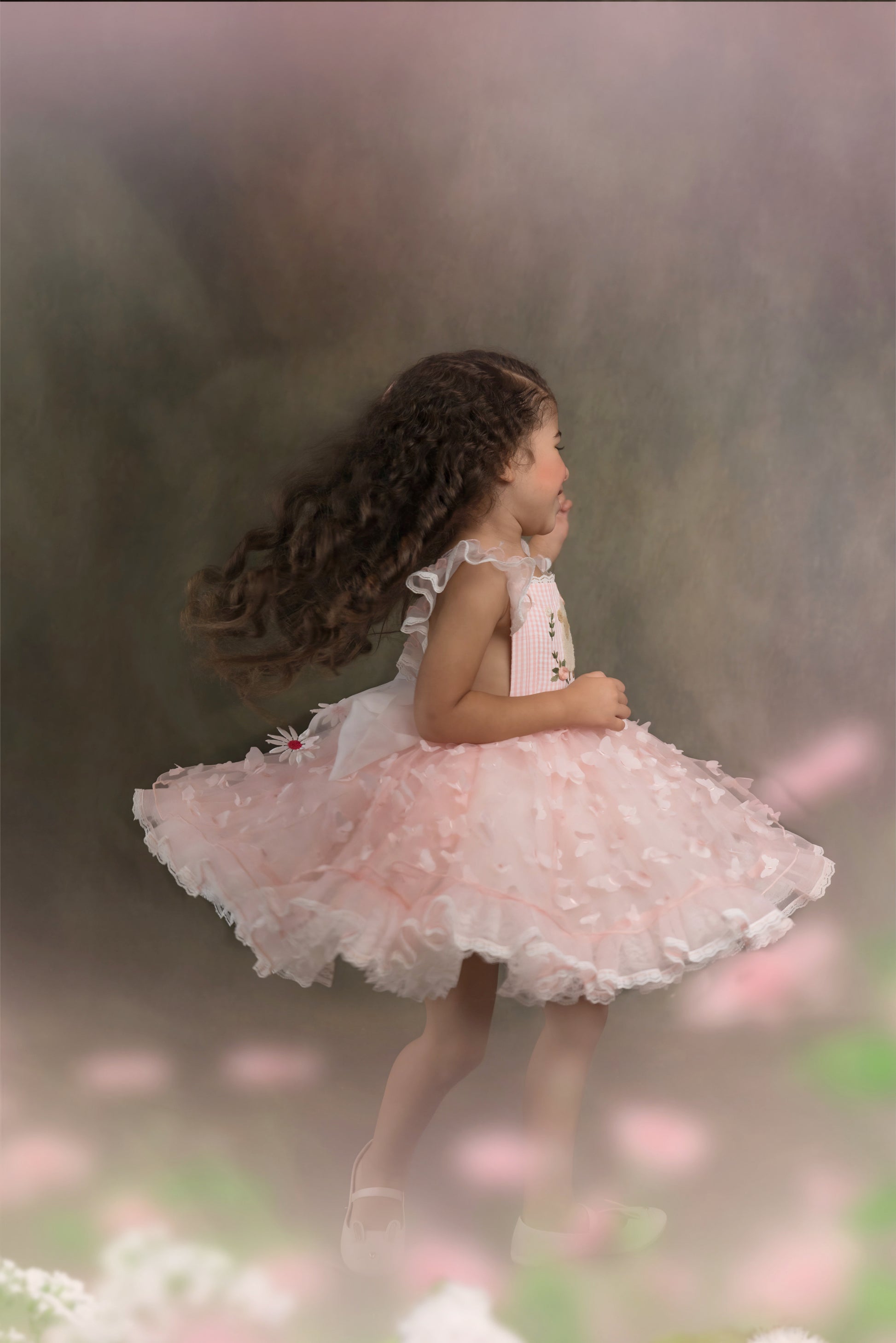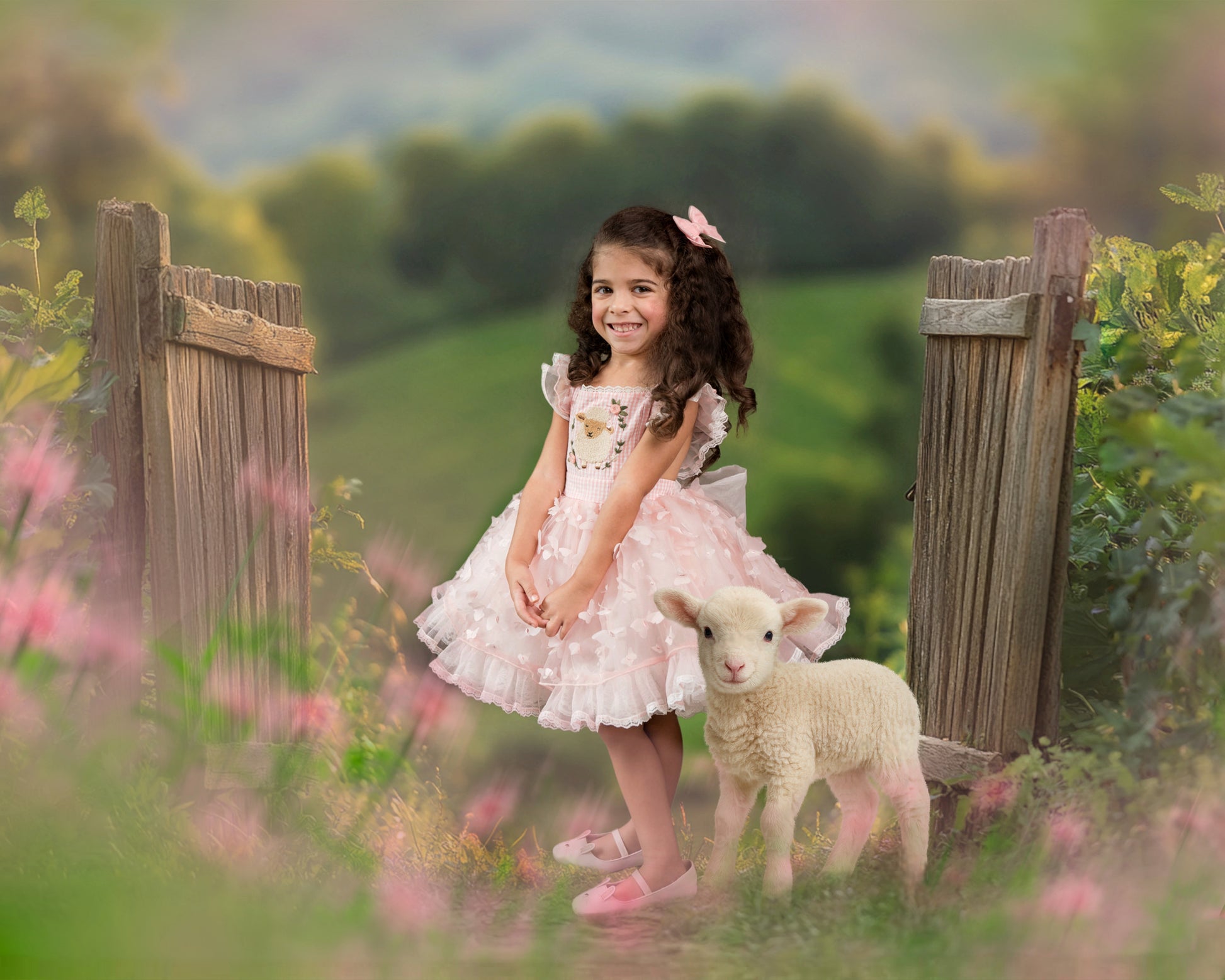 Celebrate the magic of spring with a designer piece that feels as special as the little girl who wears it. This limited edition pastel pink dress features a whimsical three dimensional butterfly tulle skirt that gently overlays layers of lace and a softly expanding pettiskirt, creating a floating, fairytale silhouette. The gingham bodice is adorned with a lovingly hand embroidered lamb surrounded by sweet floral touches, making it a true work of art. Adjustable flutter straps allow for a customizable fit and cross in back for added charm, while the elastic waist ensures comfort all day long. A gorgeous organza bow sash ties the look together with a graceful finish. Matching pink gingham bloomers, complete with floral details, make this set perfect for active little ones who still want to look their Sunday best. Whether for Easter celebrations, spring family photos, or simply making memories in the sunshine, this dress is designed to make your daughter or granddaughter look absolutely angelic, and to give you the joy of knowing she’s wearing something as beautiful and unique as she is.
