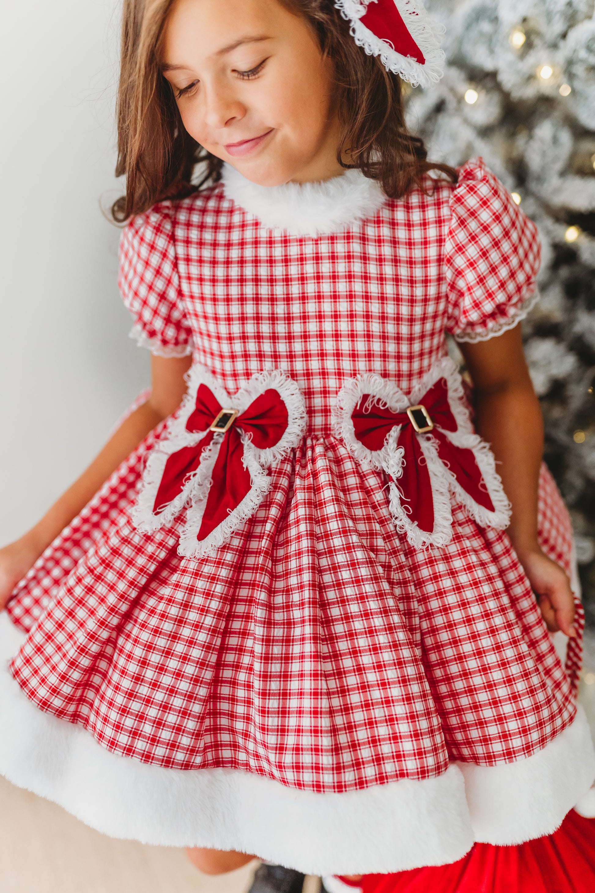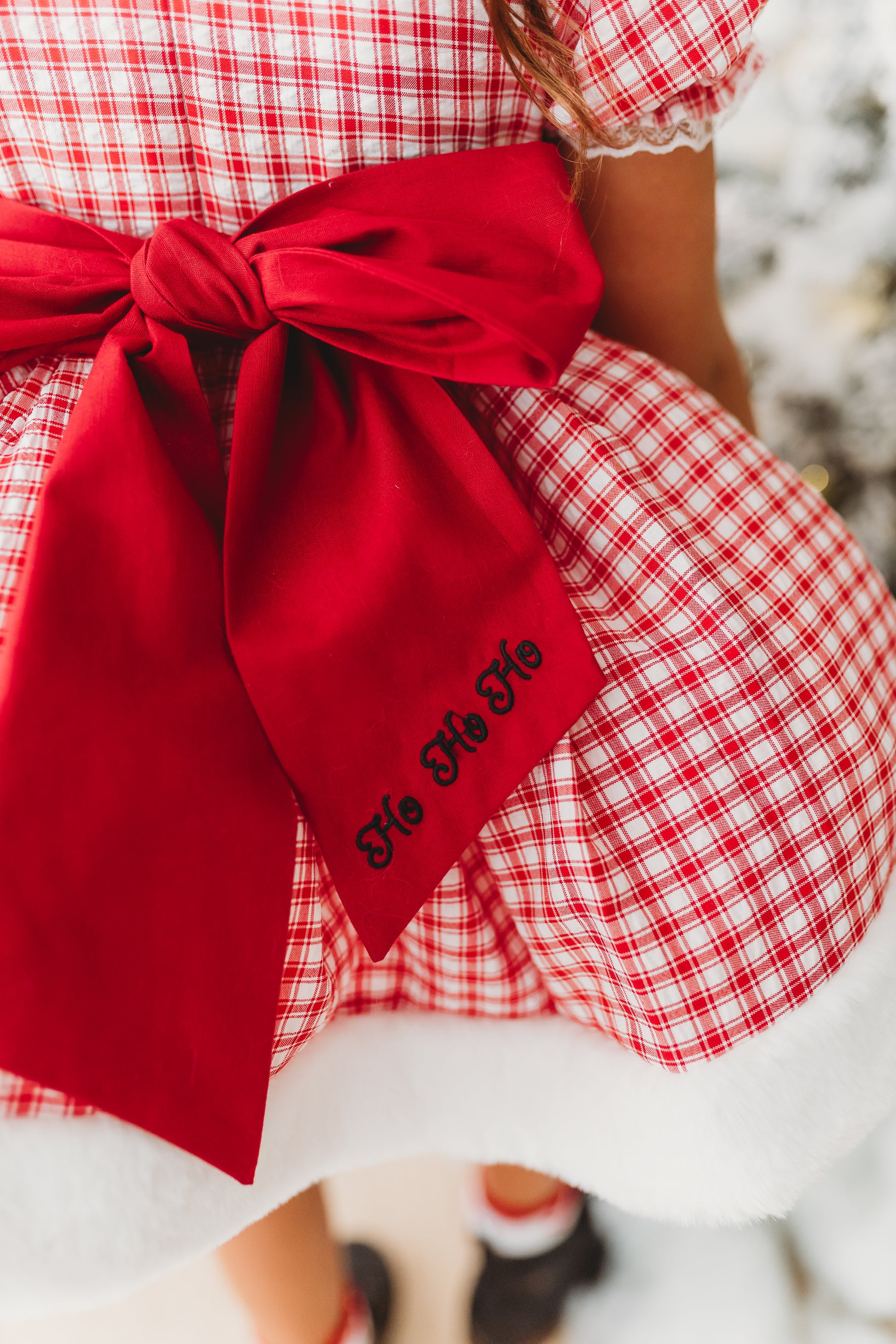 The gingham pettiskirt dress is a true holiday heirloom, featuring cap sleeves, soft faux fur trim reminiscent of Santa’s suit, and a velvet sash adorned with “ho, ho, ho” embroidery. Delightful Santa bows on each hip bring a signature twist of festive whimsy, while the matching bloomers ensures comfort.
